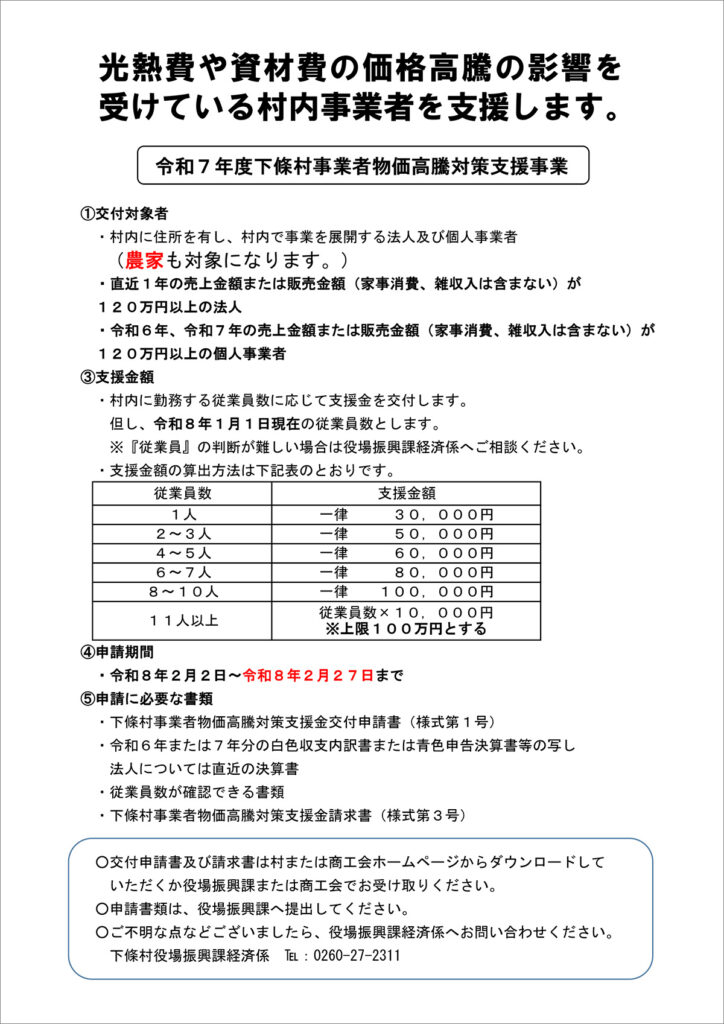 令和7年度下條村事業者物価高騰対策支援金のご案内 2026年1月28日